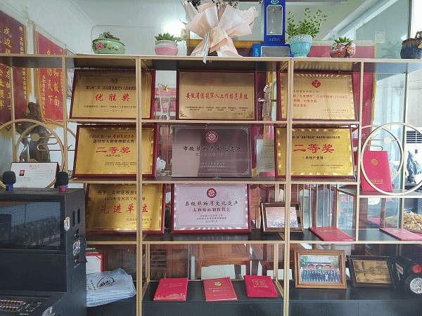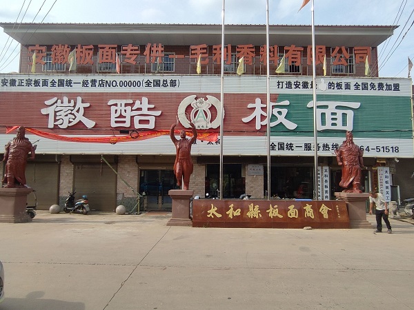 七月的太和,日头正足,芳华满簇,调研实践团前往太和县板面商会。铜黄铁字的“太和县板面商会”几个大字映入眼帘,抬头望去“徽酷板面”的招牌配着鲜明对比的红绿底板,深深印在眼中。太和县板面商会会长阮先生带大家走进板面的世界,细细讲解着太和牛肉板面发展鼻祖创始人宋建平与丁文喜的故事:作为退伍军人的他们迎着改革开放的大潮,开始了安徽板面的经营,逐渐打出属于自己的招牌,拉着板车让太和板面走出安徽,走向全国。太和板面承载着一代代人的智慧与劳动,更是作为一种文化符号,一颗文化纽扣。