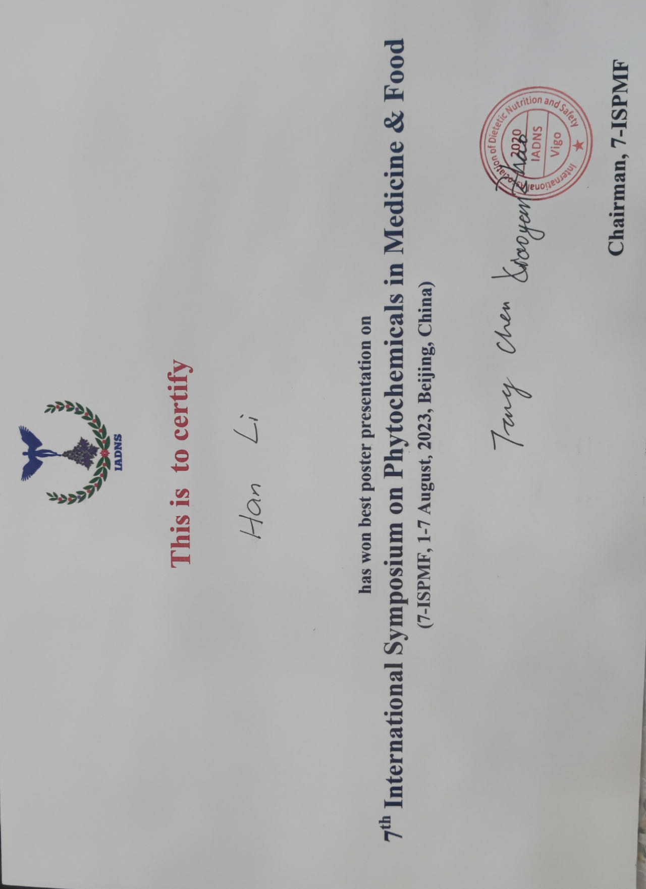 会议期间,翟科峰教授介绍了大赢家体育生物与食品工程学院在天然产物与食品科学领域的最新研究进展,还与境内外专家就合作研究项目进行了深入的洽谈,探讨了共同关心的科研问题,商讨了未来在该领域的合作计划。3名硕士研究生积极参与墙报的展示与角逐,翟科峰教授指导的硕士研究生李晗斩获最佳海报奖。