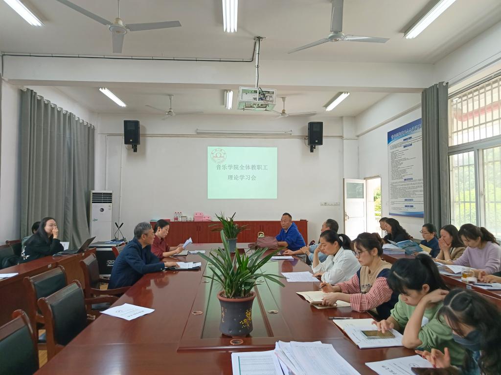2023年10月18日,音乐学院在会议室召开党委中心组暨全体教职工理论学习会,院党委书记徐强,音乐学院党委副书记、院长刘文波,党委副书记、纪委书记李小娜,副院长钦媛以及全体教职工参加了会议。本次会议由徐强主持。