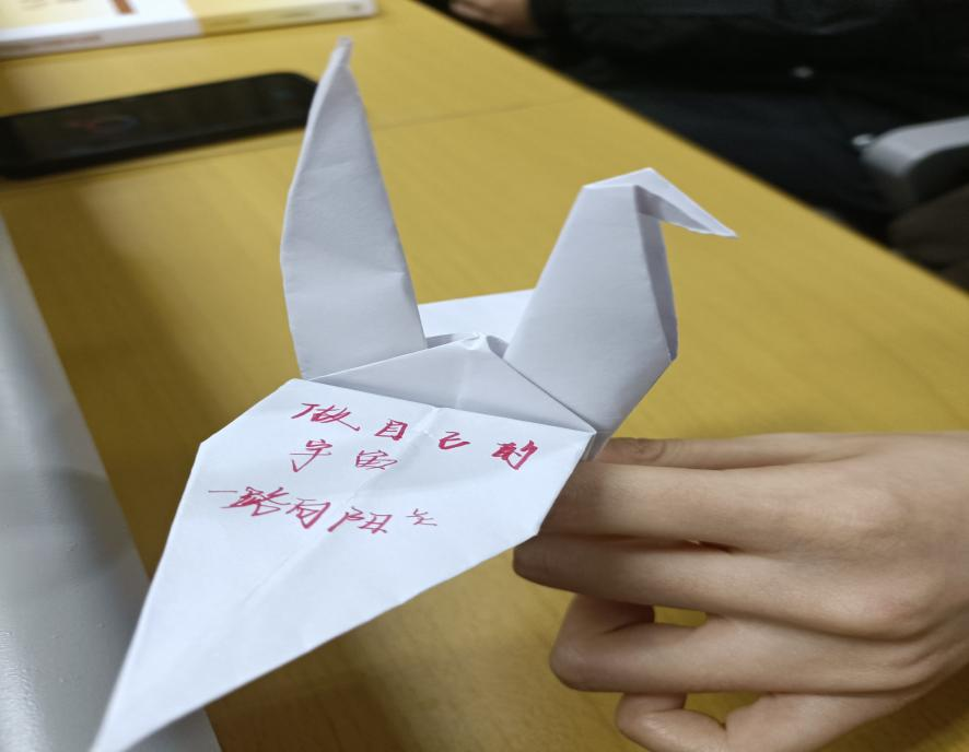11月27日,22文化产业管理班在教学楼A413开展了“敞开心扉,拥抱快乐”为主题的心理教育活动。在心理委员的组织下,同学们先在便签纸上写出承载着满满温情的祝福寄语,然后将其折叠成千纸鹤的形状,最后,一只只栩栩如生的“小飞鹤”映入眼帘,一句句暖人心扉的话语动人心弦。同学们以此来释放压力、体会快乐、放松身心。
