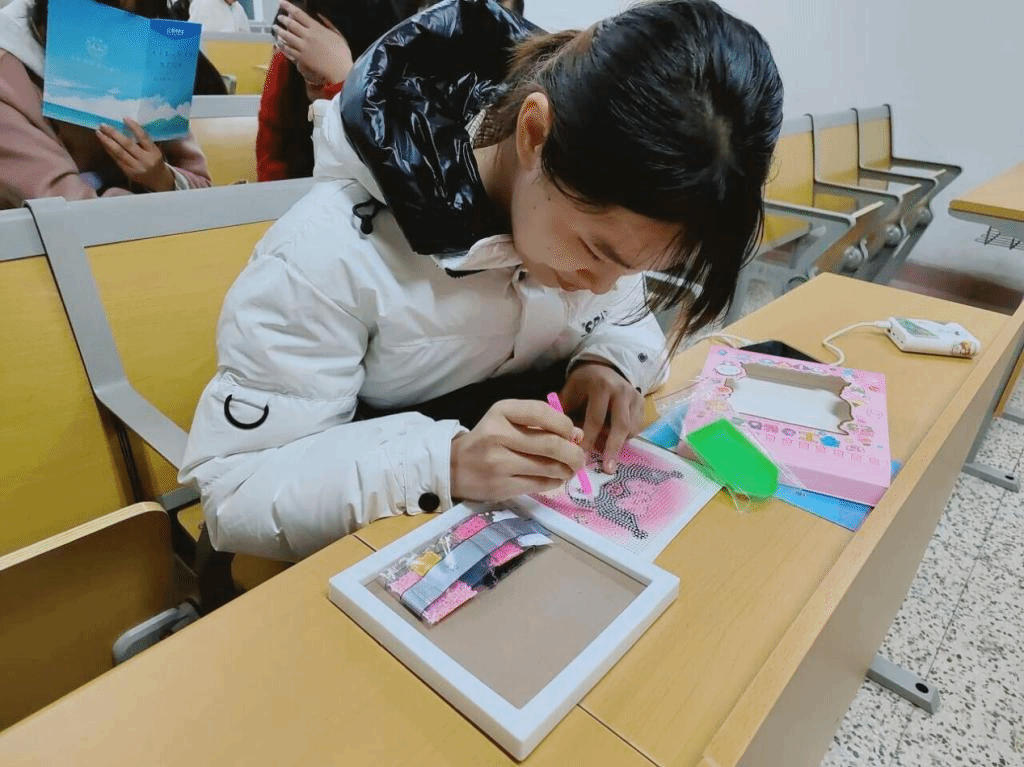 11月27日,22汉语言2班在教学楼A311举行了以“钻石入画,心绽繁花”为主题的心理教育活动。同学们分成了各个小组,然后各小组成员拿出材料分工协作进行手工制作钻石画。最后,在各组同学们的认真配合、齐心协力之下,一幅幅闪闪发光的可爱卡通钻石画就横空出世了。