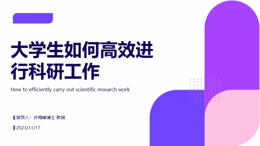 2023年11月17日15:30,在实训楼A113,许海峰教授面向计算机科学与技术专业学生,作了“大学生如何高效进行科研工作”的报告。