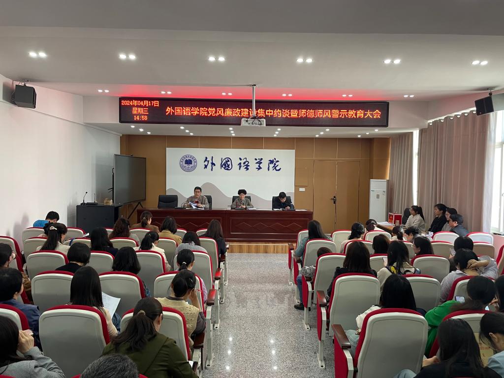 4月17日下午,外国语学院党风廉政建设集中约谈暨师德师风警示教育大会在逸夫楼一楼会议室召开。在校院领导班子成员和全体教职工参加会议。学院党委副书记、纪委书记张亚锋主持会议。