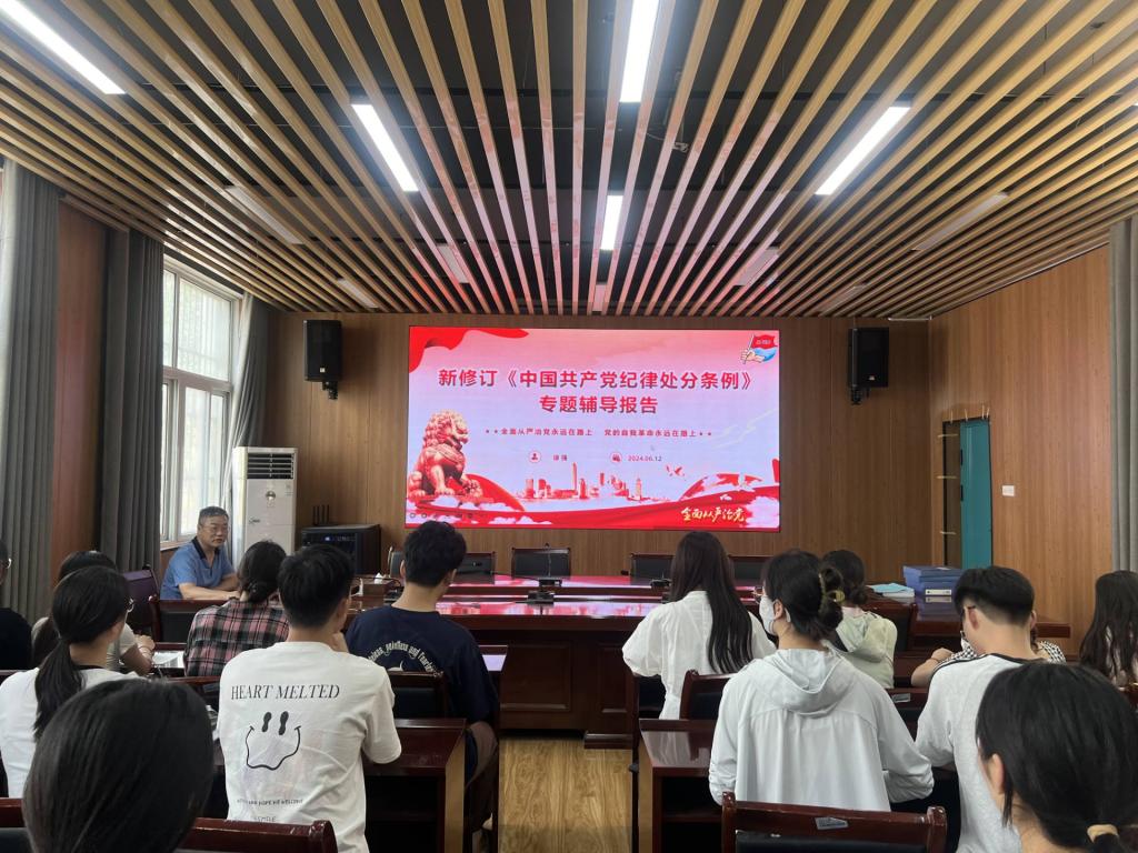 徐强以新修订的《中国共产党纪律处分条例》为主题为毕业生党员做了专题报告,从深刻认识修订《条例》的重要意义,准确把握《条例》修订的主旨要义,抓好《条例》的贯彻执行,以严明的纪律推进党的自我革命等三个方面引导毕业生党员学深学透,不断增强自我净化、自我完善、自我革新、自我提高能力,增强“四个意识”、坚定“四个自信”、做到“两个维护”。