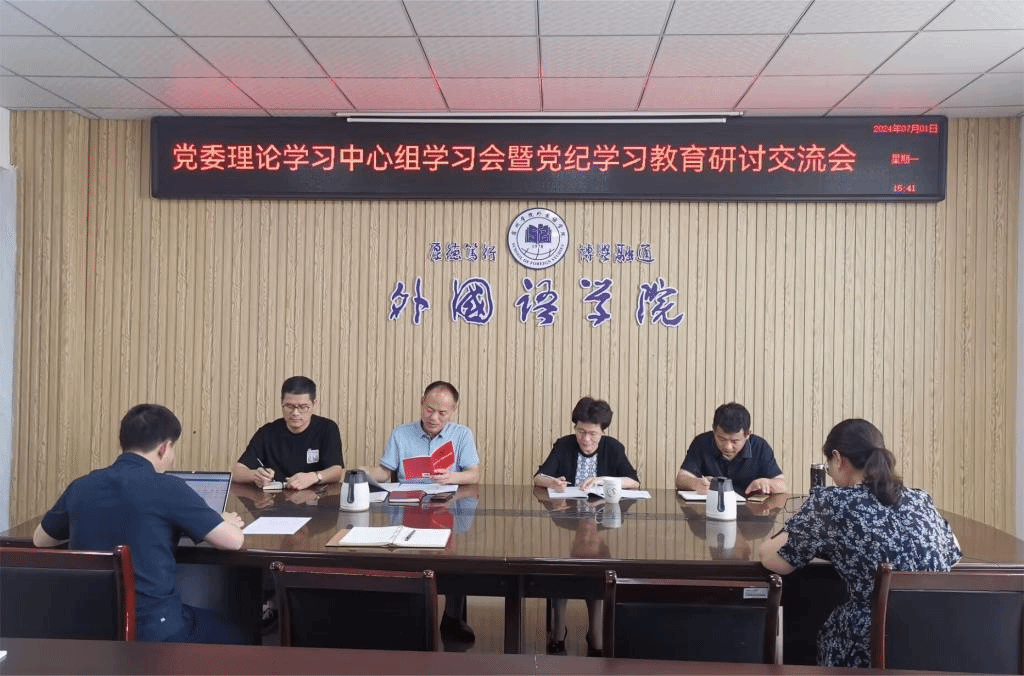 为庆祝中国共产党成立103周年,扎实推进党纪学习教育,7月1日下午,外国语学院在逸夫楼A318会议室召开了党委理论学习中心组学习会暨党纪学习教育研讨交流会,会议由党委书记郝景东主持。