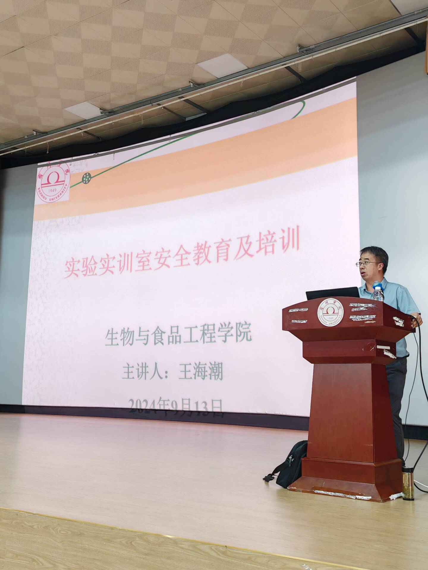 9月13日上午生工学院教学副院长王海潮,为全院新生进行实验室安全教育讲座,讲座中他强调实验室安全问题事关重要,结合最近各高校发生典型的安全事故案例进行剖析,向大家介绍了进入实验室应具备的基本知识、安全防灾应掌握的基本常识,着重强调了培养实验室安全意识的重要性和必要性,提醒学生要提高安全意识,遵循实验安全守则。