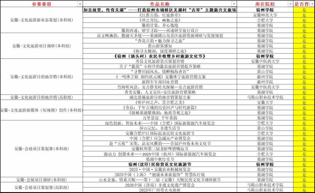作为入选中国高等教育学会“学科竞赛评估上榜目录”的A类比赛,在人才培养、学科建设和产教融合等方面发挥重要作用。本次比赛由中国国际贸易促进委员会商业行业委员会、中国国际商会商业行业商会、中国商业经济学会主办,巢湖学院承办,学生组分为安徽-文化旅游新业态策划(本科组)、安徽-文化旅游项目调研(本科组)、安徽-文化旅游目的地营销(本科组)、安徽-文化旅游新媒体(短视频)创作(本科组)、安徽-会展项目策划赛(本科组)、安徽-会展项目调研(本科组)等赛道。会议主要分为现场评审、专家点评、颁奖仪式三个部分,经过激烈的角逐,我院学子有三支队伍进入国赛,力争在国赛竞技舞台上熠熠生辉。