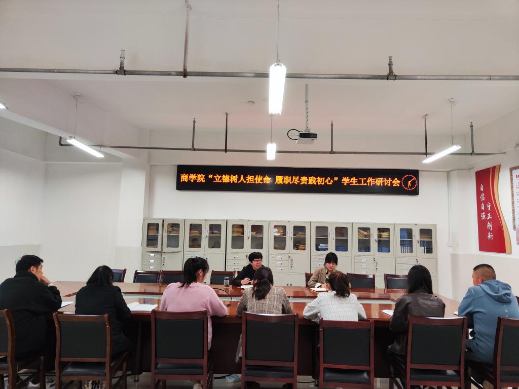 10月28日下午,商学院召开“立德树人担使命 履职尽责践初心”学生工作研讨会。院党委书记王淑霞主持会议,党委副书记张锐锐、分团委副书记曹超超、学生事务科副科长孙茂顺以及全体专职辅导员参加会议。