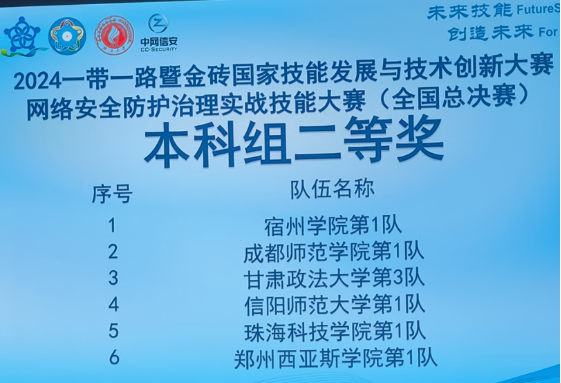 12月20日,2024“一带一路”暨金砖国家技能发展和技术创新大赛网络安全防护治理实战技能赛项全国总决赛在广西大学圆满闭幕。在这场汇聚了全国120支顶尖队伍的竞技盛宴中,我校代表队以卓越的表现荣获本科组二等奖,实现了学校在该项赛事上的新突破。