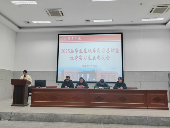 12月26日中午,体育学院2025届毕业生秋季实习总结暨优秀实习生表彰大会在体育馆报告厅开展。体育学院党委书记李高,党委副书记、院长白明,体育学院党委副书记、纪委书记王德玉,副院长陈芳芳,相关专业负责人、教研室主任、副主任、实习实训中心、实习指导老师及全体秋季实习生参加了会议。