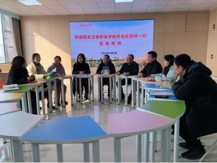1月3日上午,皖北卫生职业学院学生处处长张锋、团委书记杨海波一行4人来我校调研交流。我校党委学生工作部部长甘守飞、副部长徐国庆及大学生心理健康教育与咨询中心老师参加调研座谈会。