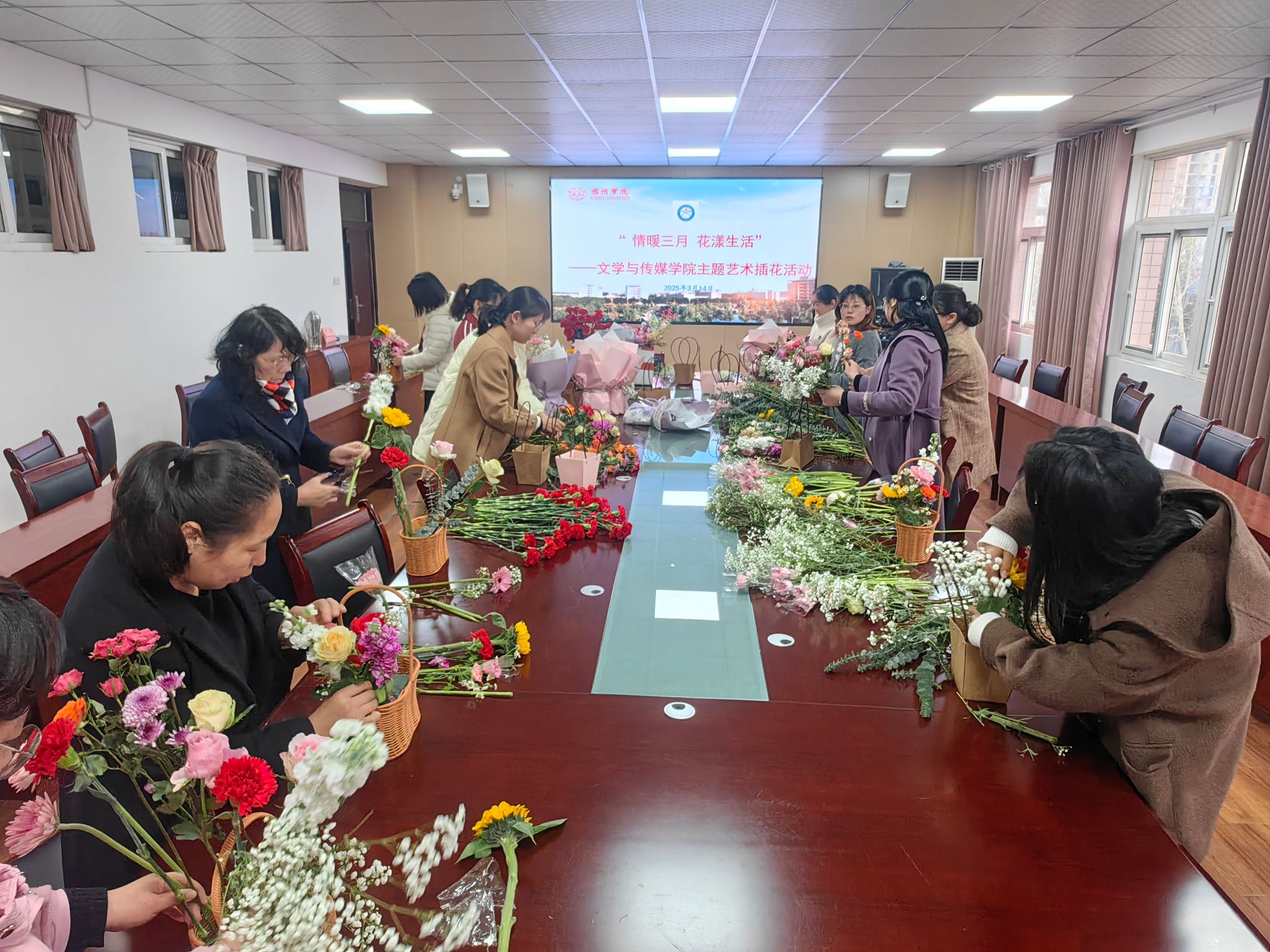 春风拂槛花千簇,巾帼三八展风采。为丰富女职工精神文化生活,凝聚奋进力量,3月14日,文学与传媒学院分工会策划了“情暖三月 花漾生活”主题艺术插花活动。