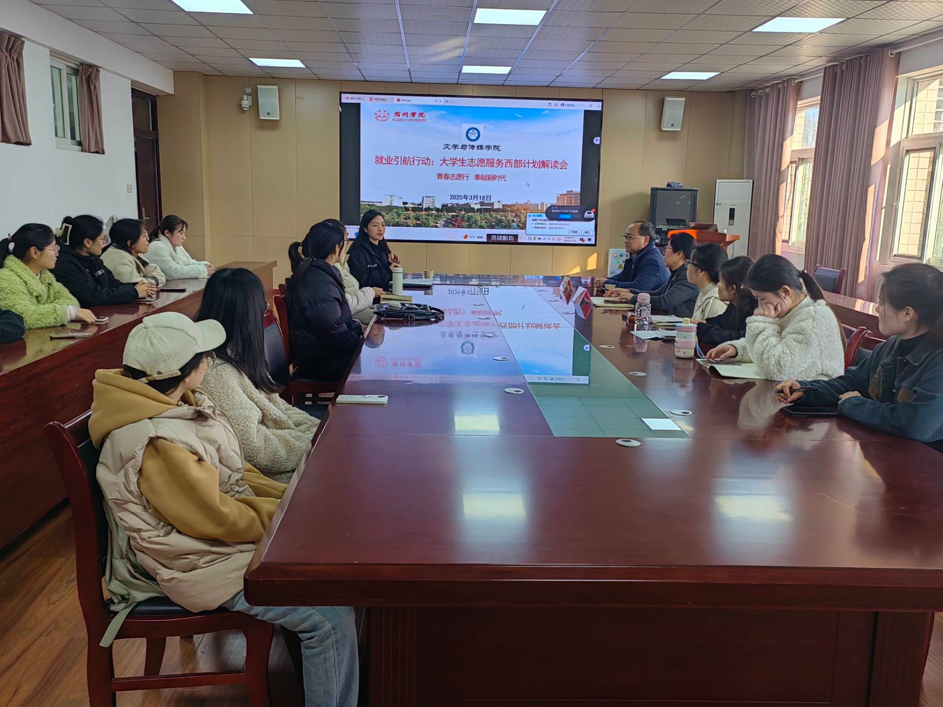 为引导大学生树立正确的就业观,号召青年大学生深入基层,弘扬志愿服务精神,近日,文学与传媒学院举办了“就业领航行动之大学生志愿服务西部计划解读会”。邀请文传学院2024届优秀毕业生、西部计划志愿者、省西部计划宣讲团成员金雪儿主讲。文学与传媒学院党委书记王金岭主持会议,党委副书记、纪委书记刘影及毕业班辅导员、学生代表等参加会议。