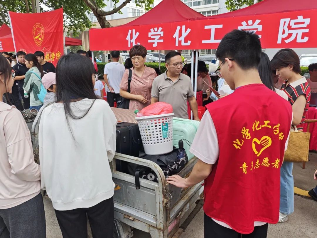 迎新现场,“志愿红” 是最亮眼的色彩。学院志愿者们早早到位,从校门口的 “接站引导”,到宿舍楼下的 “行李搬运”,再到报到点的“手续协助”,他们的身影穿梭在校园各处。穿着统一志愿者服装的同学,或是帮新生拎着沉甸甸的行李箱,或是坐在服务桌前快速为新生核对信息,用热情的微笑、高效的行动,让初来乍到的新生感受到 “家人般的温暖”,也展现出化院学子互助友爱的精神风貌。