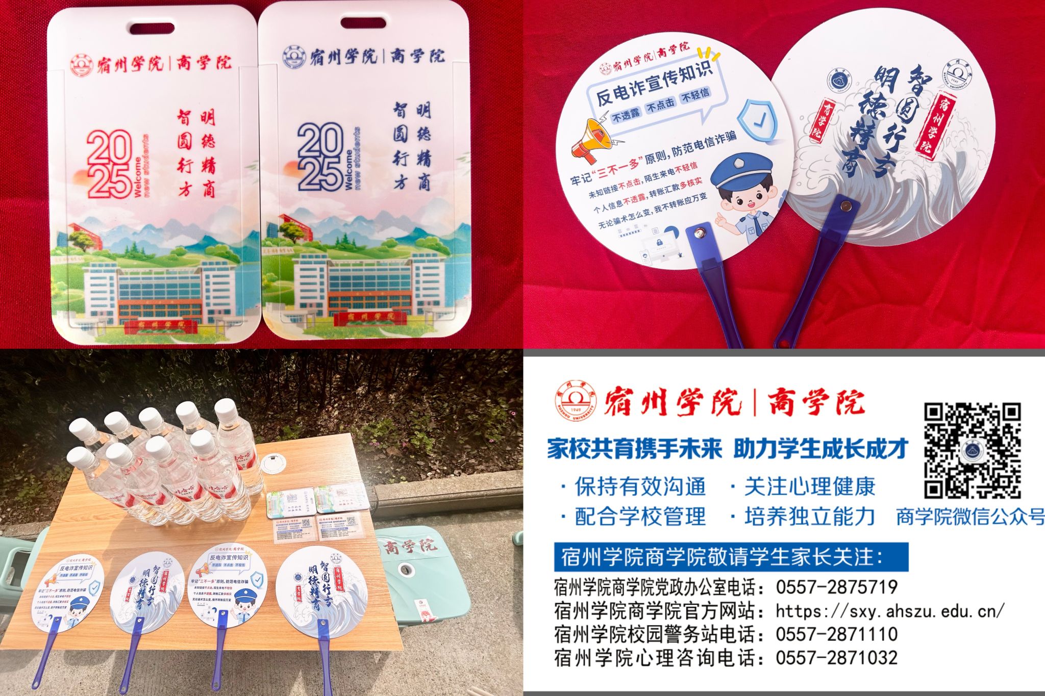 安全是大学的第一课,商学院将安全教育融入迎接新生的各个环节。从班级群里的温馨提醒,到迎新礼品上的反电信诈骗知识宣传,到学院领导、老师们的关怀入寝,从入学一刻为新生安全成长保驾护航。