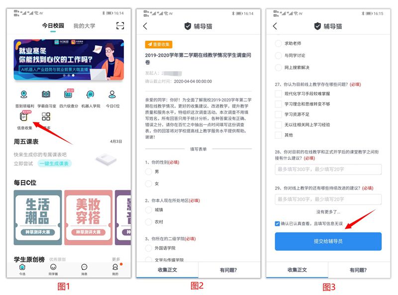 1.本次在线教学情况学生问卷调查由教学质量监控与评估处组织开展,各二级学院辅导员负责具体实施。各二级学院辅导员组织参加网络课程学习的全体学生在调查时段内利用“今日校园”APP完成问卷调查,具体操作流程为:在“今日校园”APP中点击“信息收集”(如图1),进入“信息收集”界面,选择“2019-2020学年第二学期在线教学情况学生调查问卷”(如图2),填写完成并点“提交给辅导员”(如图3),完成调查问卷。每位学生仅能进行一次完整问卷。