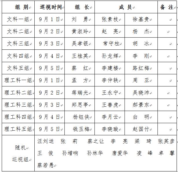 1.学校期末考试巡视组由全体校领导、有关职能部门负责人、校教学督导委员会委员和各二级学院书记或副书记组成,巡视分组及成员名单如下表: