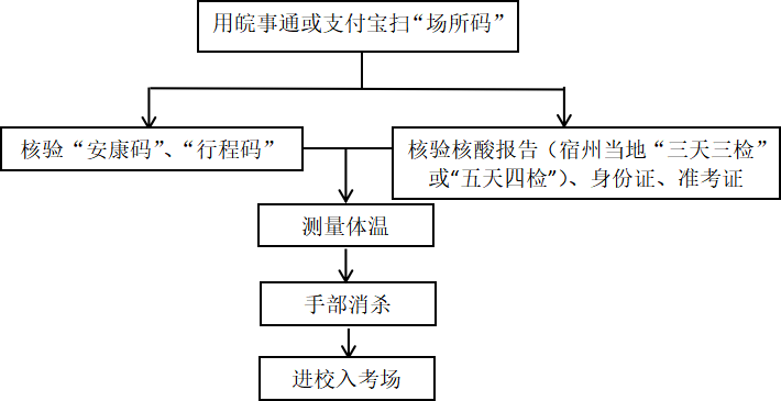 考试当天,返校考生须从南门进出,严禁从北门进出;其余师生须从北门进出,严禁从南门进出。考生沿体温检测通道,分散有序进场。进校时实行“六必查一询问”(查验身份证、准考证、安康码、行程码、考试考前5天宿州当地出具的4次核酸检测阴性证明(低风险)或考试考前连续3天宿州当地出具的核酸检测阴性证明(疫情防控常态化地区)(纸质版或电子版均可)、检测体温,询问有无发热、干咳、腹泻等新冠肺炎相关表现症状),对可疑症状患者必须详细询问具体的症状体征和流行病学史。体温正常(低于37.3℃)、场所码为绿码且符合“三、返校考生要求”的考生方可进校参加考试。