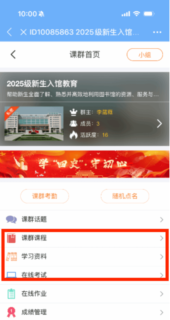 1.应用市场搜索“易班”下载并安装;进入“易班优课”,注册登录后,在“课群-添加课群”输入课群邀请码3LRAL96L加入2025级图书馆入馆教育课群。