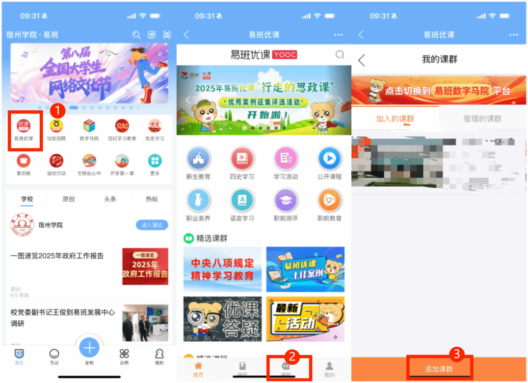 1.访问易班网网址:https://www.yiban.cn/;进入“易班优课”,注册登录后,在“我的课群-添加课群”中输入课群邀请码3LRAL96L加入2025级图书馆入馆教育课群。