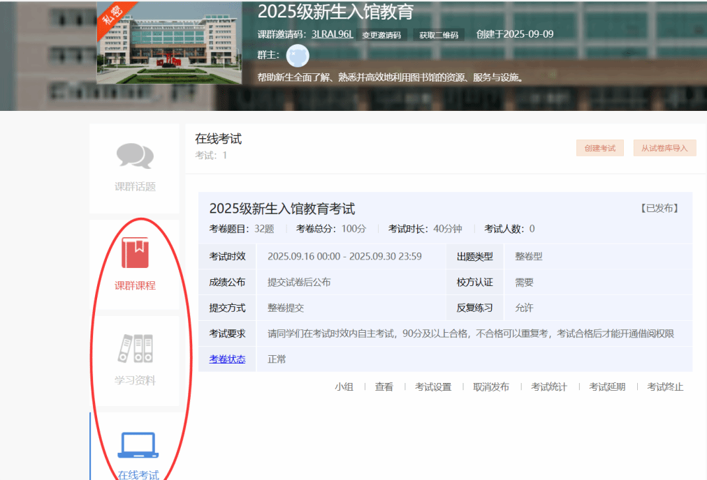 2.自主学习课群课程及相关资料后,即可参加在线考试。