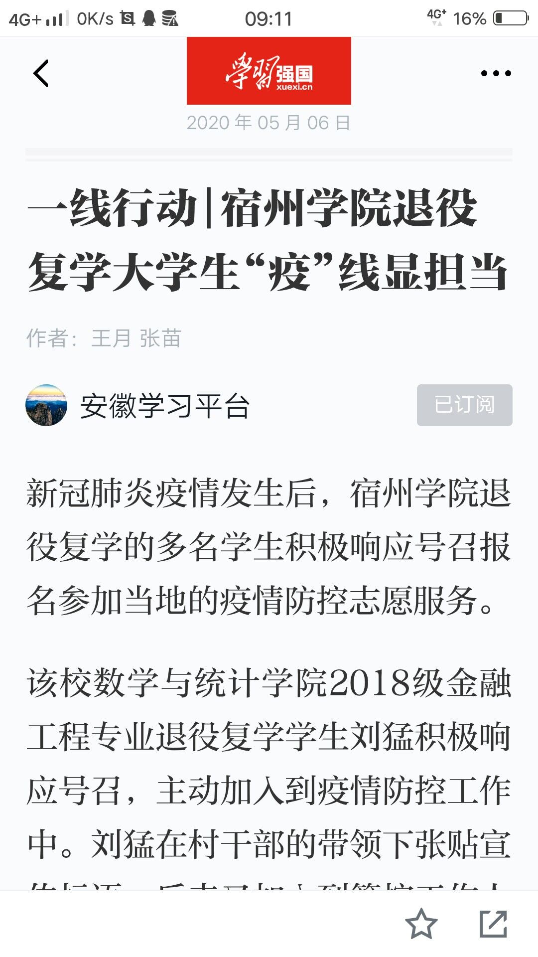 5月6日,《学习强国》以《大赢家体育退役复学大学生“疫”线显担当》为题,对我校退役复学大学生疫情防控期间,参加家乡疫情防控工作的消息进行了报道。
