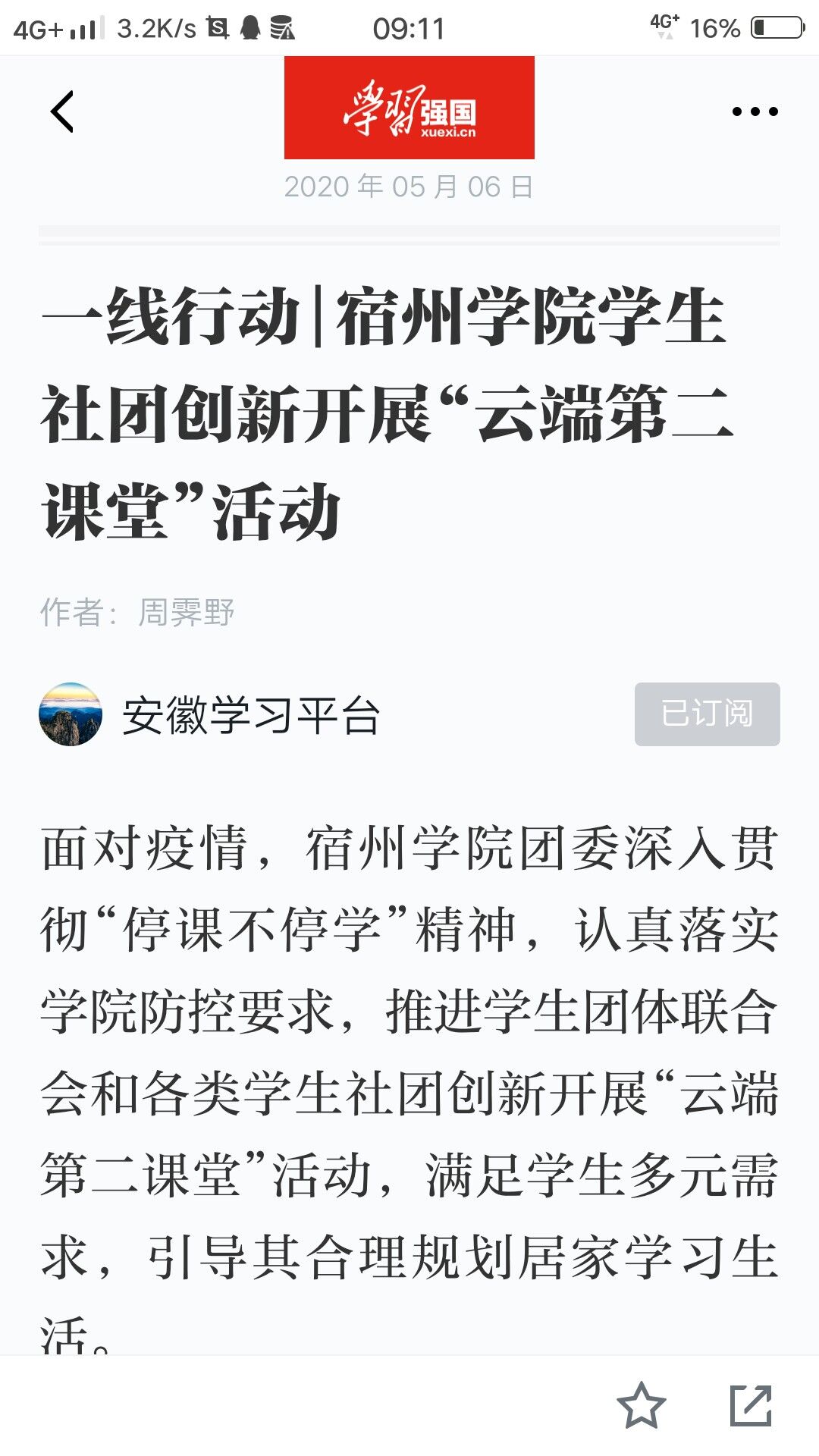 5月6日,《学习强国》以《大赢家体育学生社团创新开展“云端第二课堂”活动》为题,对我校团委组织学生社团开展“云端第二课堂”活动的消息进行了报道。
