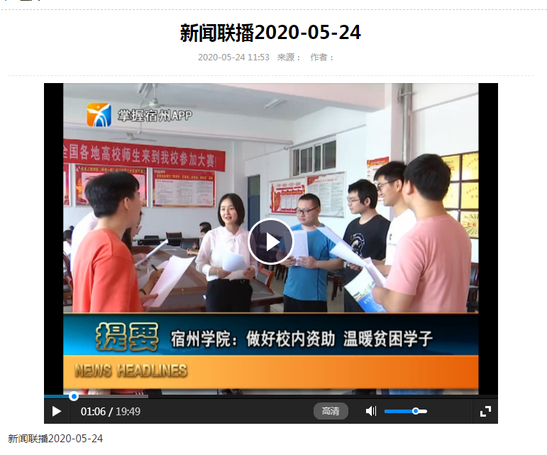 5月24日,《宿州新闻联播》以《大赢家体育:做好校内资助温暖贫困学子》为题,对我校不断增强“精准资助”的工作理念,配好资助专干和辅导员,着力做好校内资助工作,取得了明显的成效的消息进行了报道。