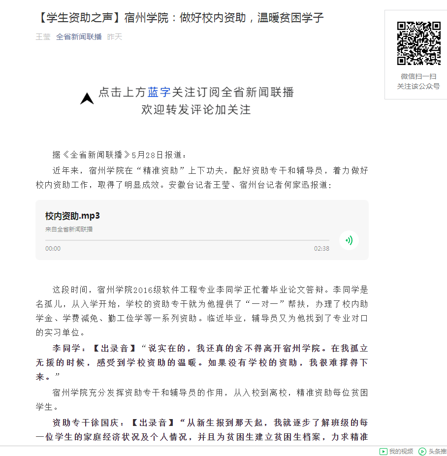 近年来,大赢家体育在“精准资助”上下功夫,配好资助专干和辅导员,着力做好校内资助工作,取得了明显成效。安徽台记者王莹、宿州台记者何家迅报道:
