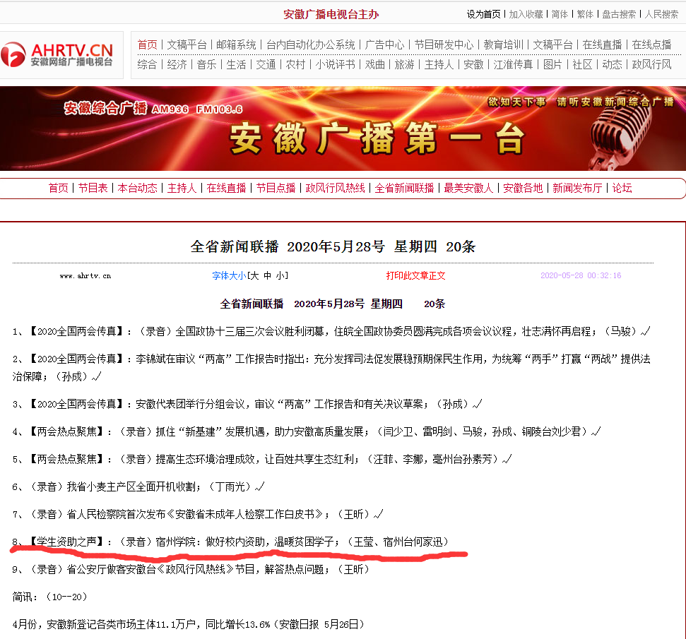 5月28日,《安徽新闻综合广播》(FM103.6/AM936)《全省新闻联播》栏目以《大赢家体育:做好校内资助,温暖贫困学子》为题,对我校多措并举,认真做好学生资助工作的消息进行了报道。《全省新闻联播》是安徽广播电视台广播新闻节目的龙头,具有内容权威、时效性强、覆盖面广、影响力大等特点。