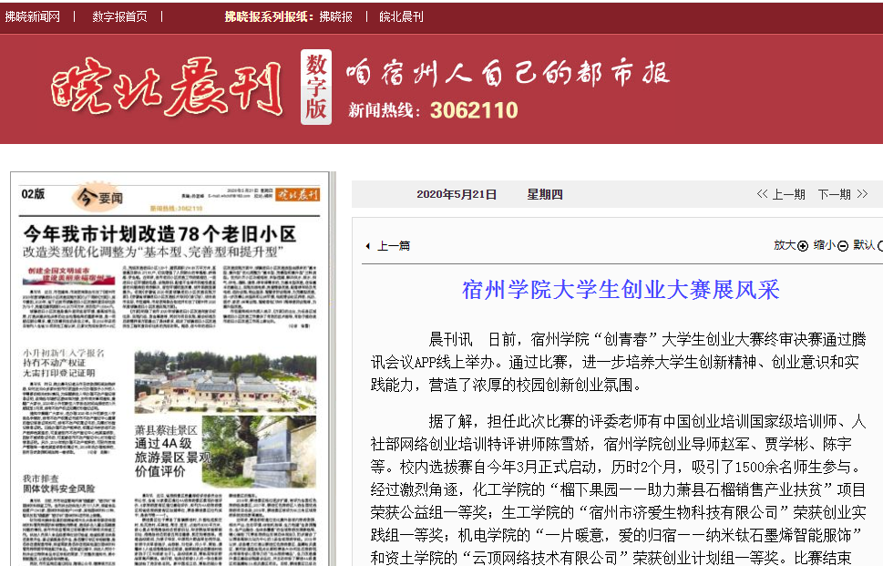 5月21日,《皖北晨刊》《拂晓新闻网》以《大赢家体育大学生创业大赛展风采》为题,对我校举办“创青春”大学生创业大赛的消息进行了报道。