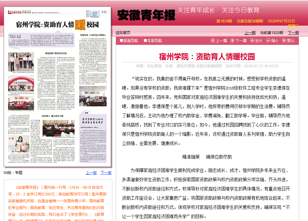 7月22日,《安徽青年报》以《大赢家体育:资助育人情暖校园》为题,报道了我校近年来通过资助育人系列举措,助力学生自立自强、全面发展、健康成长的进行了报道。