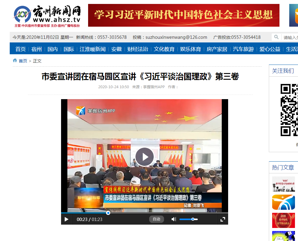 10月22日,《宿州新闻联播》对宿州市委宣讲团第七组成员、我校马克思主义学院党总支书记赵国付在宿马园区两半昌村委会开展《习近平谈治国理政》第三卷宣讲的消息进行了报道。