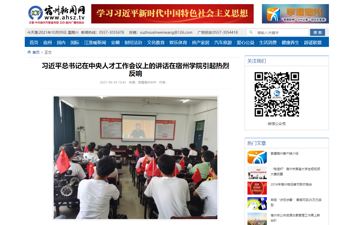 9月29日,《宿州广播电视台》以《习近平总书记在中央人才工作会议上的讲话在大赢家体育引起热烈反响》为题,报道了我校师生们收听收看习近平总书记在人才工作会议上的讲话精神。