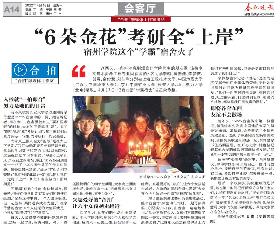 4月18日,《合肥晚报》在A14版报道了我校“6朵金花”考研全“上岸”的消息。