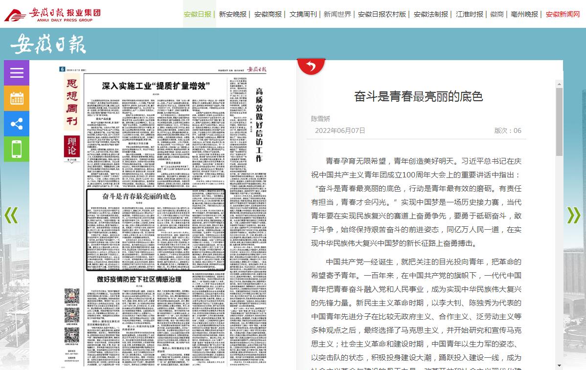 6月7日,《安徽日报》刊发了我院马克思主义学院陈雪娇教师的文章《奋斗是青春最亮丽的底色》。