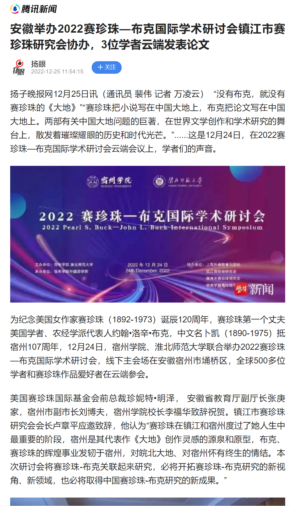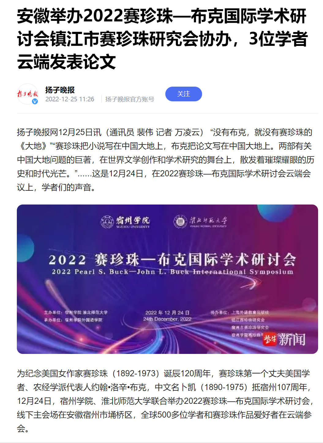 12月25日,《扬子晚报》官方微博和腾讯新闻以《安徽举办2022赛珍珠—布克国际学术研讨会镇江市赛珍珠研究会协办,3位学者云端发表论文》为题,报道了我院举办2022赛珍珠—布克国际学术研讨会的消息。