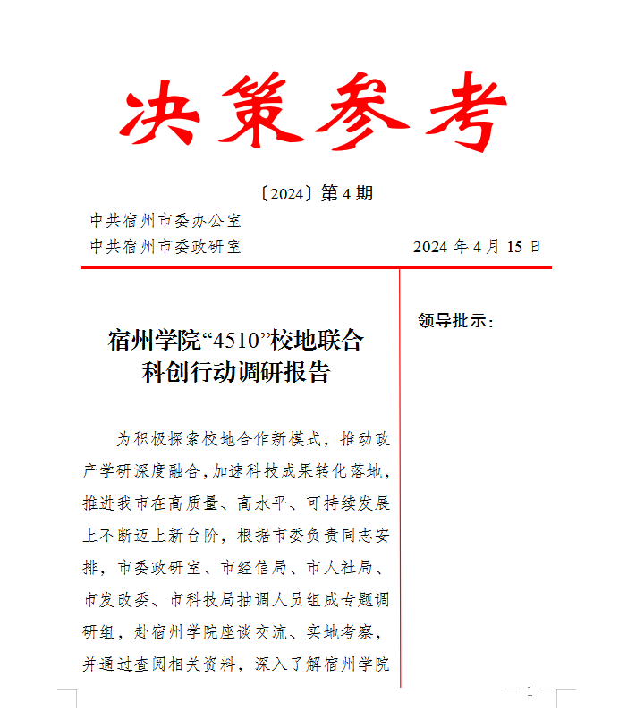 近日,市委办公室、市委政研室《决策参考》全文刊发《大赢家体育“4510”校地联合科创行动调研报告》。