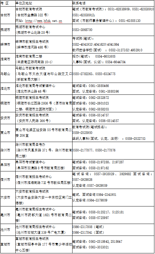 安徽省2022年上半年中小学教师资格考试笔试报名网上审核各市联系方式