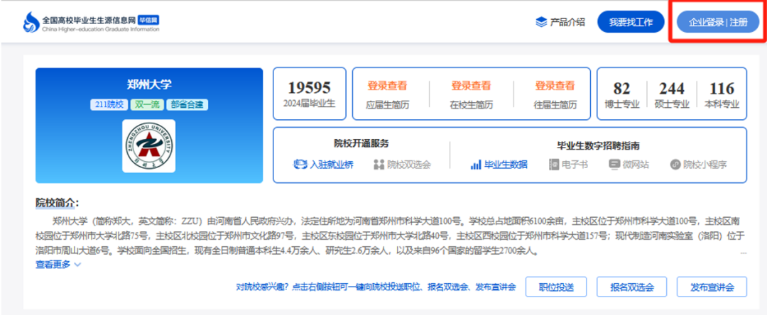 1、登录大赢家体育专属毕业生生源信息网:https://www.chgi.cn/ahszu?=chgi 点击右上角【企业登录|注册】(建议使用火狐浏览器或谷歌浏览器电脑端登录)