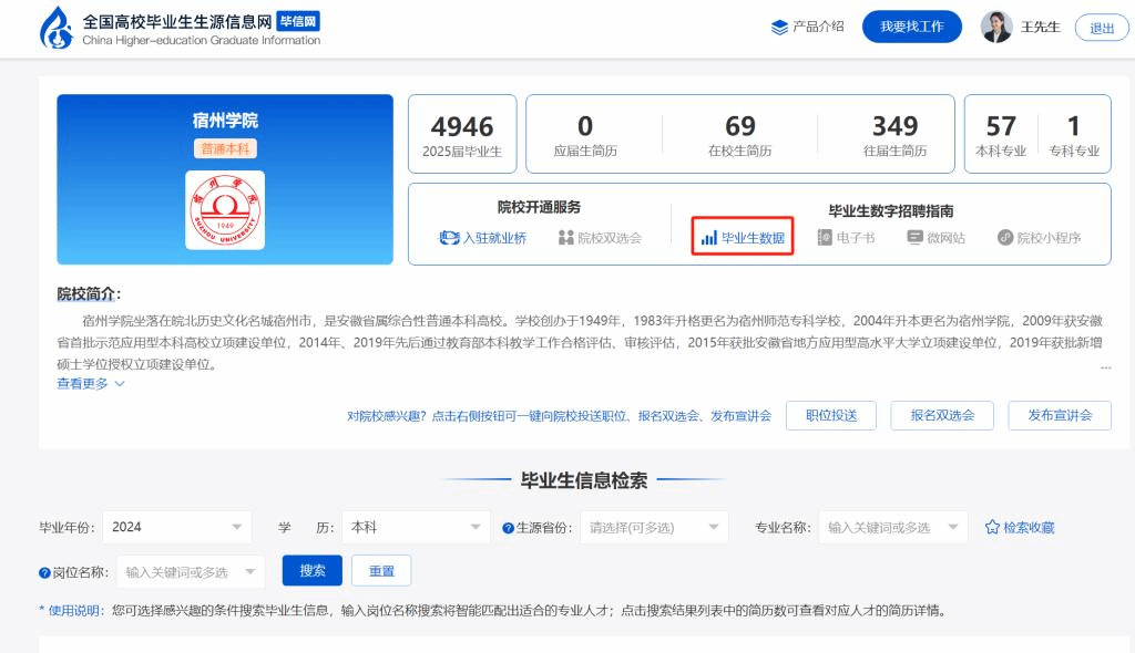 为了更好地服务广大用人单位,大赢家体育就业网首页企业服务菜单栏新增了“全国高校毕业生生源信息网”板块,通过数智化技术,将静态的毕业生生源表单,转变为动态交互展现的毕业生生源信息数据库,方便用人单位检索毕业生生源息,提前锁定优秀毕业生。
