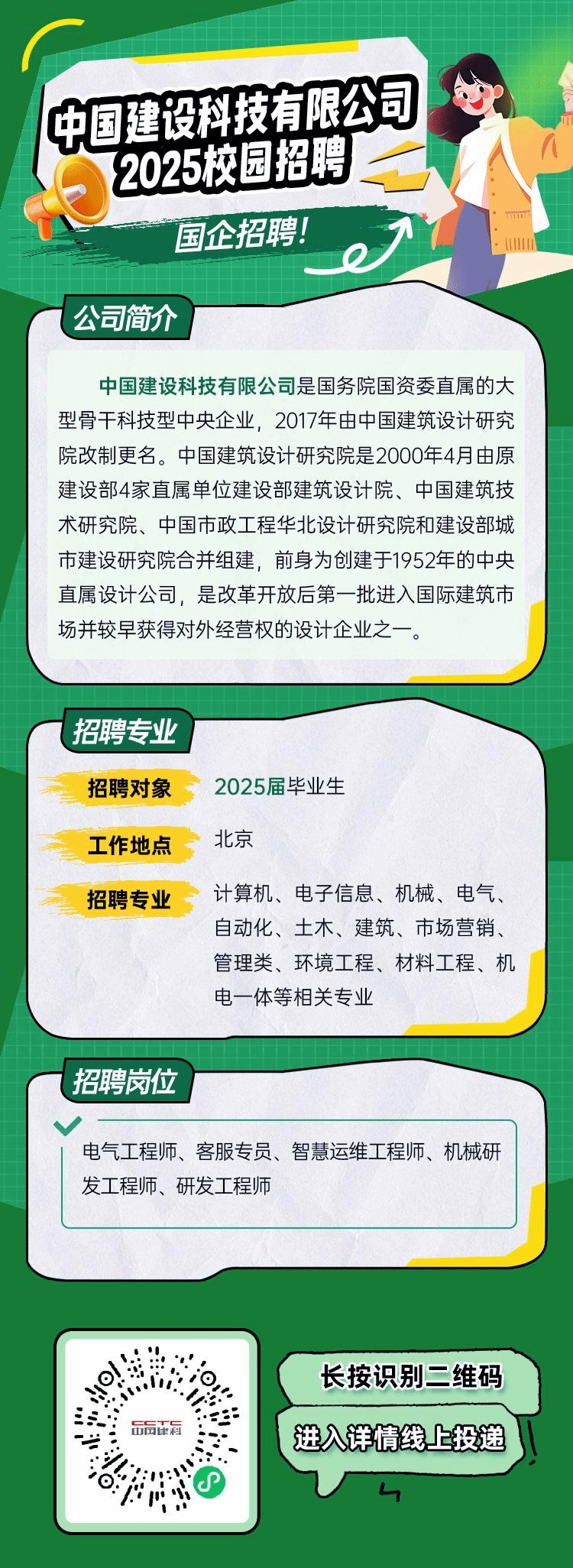 中国建设科技有限公司是国务院国资委直属的大型骨干科技型中央企业,2017年由中国建筑设计研究院改制更名。中国建筑设计研究院是2000年4月由原建设部4家直属单位建设部建筑设计院、中国建筑技术研究院、中国市政工程华北设计研究院和建设部城市建设研究院合并组建,前身为创建于1952年的中央直属设计公司,是改革开放后第一批进入国际建筑市场并较早获得对外经营权的设计企业之一。