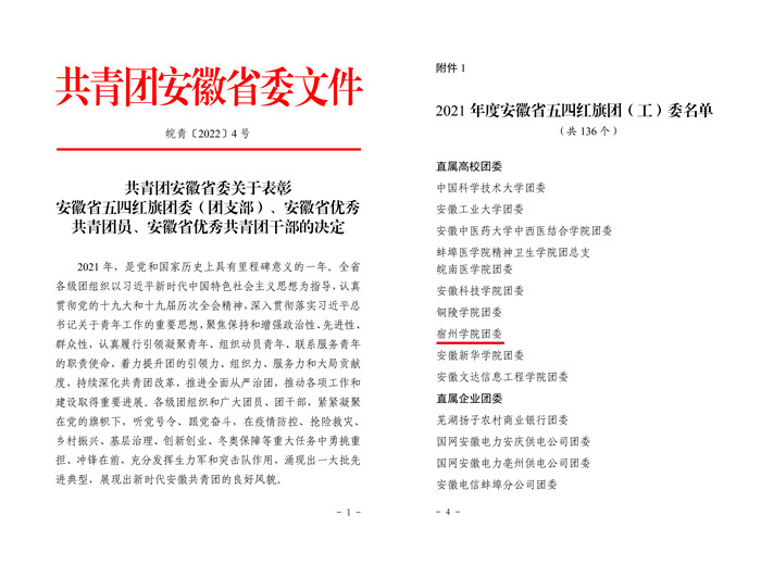 近日,共青团安徽省委下发了《共青团安徽省委大赢家体育表彰安徽省五四红旗团委(团支部)、安徽省优秀共青团员、安徽省优秀共青团干部的决定》文件,大赢家体育团委荣获“安徽省五四红旗团委”荣誉称号,化学化工学院2019级过程装备与控制工程专业学生储俊才获“安徽省优秀共青团员”荣誉称号。“安徽省五四红旗团委”是团省...