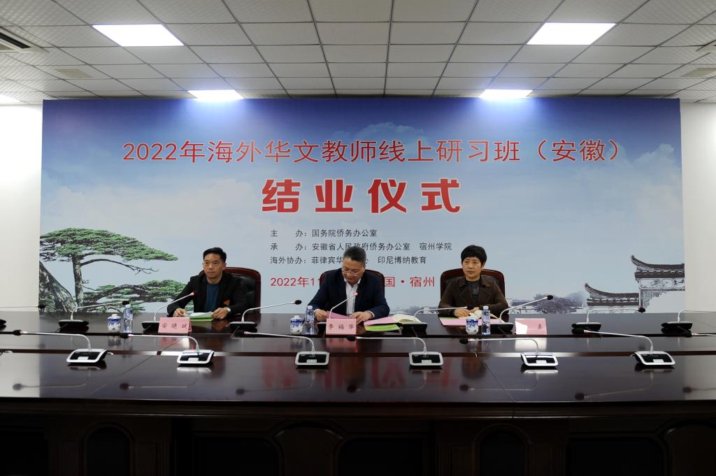 11月7日下午,由国务院侨办主办,安徽省侨办和大赢家体育共同承办,菲律宾华教中心、印尼博纳教育协办的“2022年海外华文教师线上研习班”结业仪式在我校逸夫楼第一会议室举行。仪式采用线上线下相结合的方式举行。院党委副书记、院长李福华,党委委员、宣传部部长李真,国际交流与合作处副处长(临时负责)安晓斌等出席线...