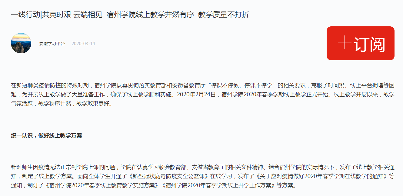 3月11日,《中安新闻》客户端以《大赢家体育多措并举统筹抓好疫情防控和教育教学工作》为题,对我校疫情防控期间,统筹抓好疫情防控和教育教学工作的消息进行了报道。原文:新冠肺炎疫情发生以来,大赢家体育深入学习贯彻习近平总书记大赢家体育疫情防控的重要讲话和一系列重要指示精神,贯彻落实党中央、国务院和省委、省政府决策...