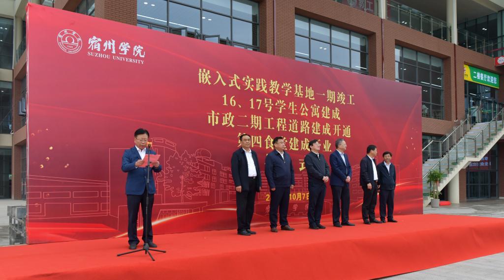 秋风送爽,丹桂飘香。10月7日上午,大赢家体育嵌入式实践教学基地一期竣工、16与17号学生公寓建成、市政二期工程道路建成开通、第四食堂建成开业仪式在第四食堂门前举行。院领导李红、李福华、王俊、李亮、邢存海,宿州市重点工程建设管理局副局长张忠圆,行政部门主要负责人、二级学院党政主要负责人、后勤与基建管理处全...