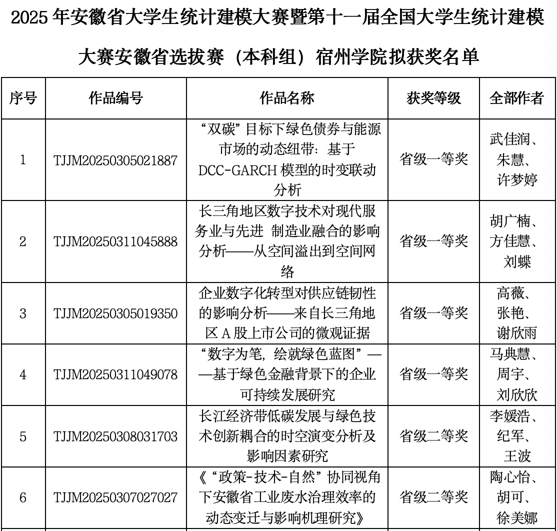 近日,2025年安徽省大学生统计建模大赛暨第十一届全国大学生统计建模大赛安徽省选拔赛(本科组)成绩揭晓,我校数学与统计学院选送的15支参赛队伍表现优异,共斩获省级一等奖4项、二等奖2项、三等奖8项的好成绩。全国大学生统计建模大赛(含省赛)是安徽省大学生学科和技能竞赛的B类赛事,本届大赛以“统计创新应用 数据...