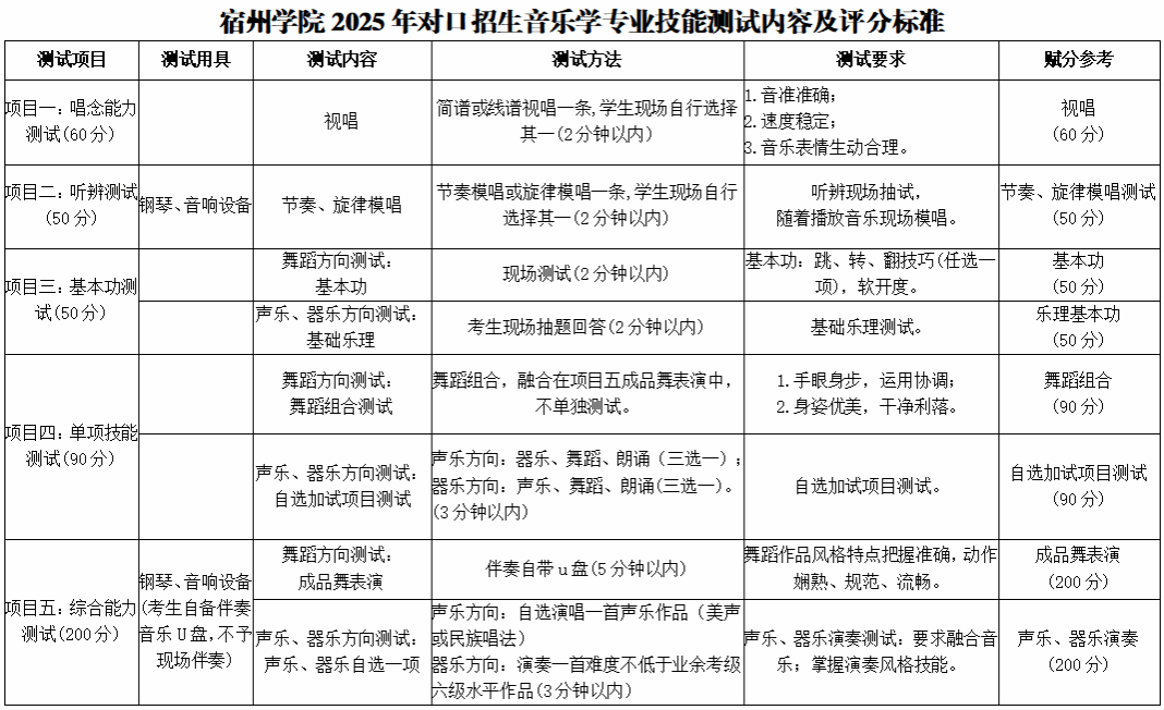 3. 大赢家体育技能测试。音乐学专业器乐、声乐、舞蹈三个方向的技能测试均参照《安徽省普通高校对口招生专业理论和技能测试考试纲要(2025年版)》执行。具体见下表。