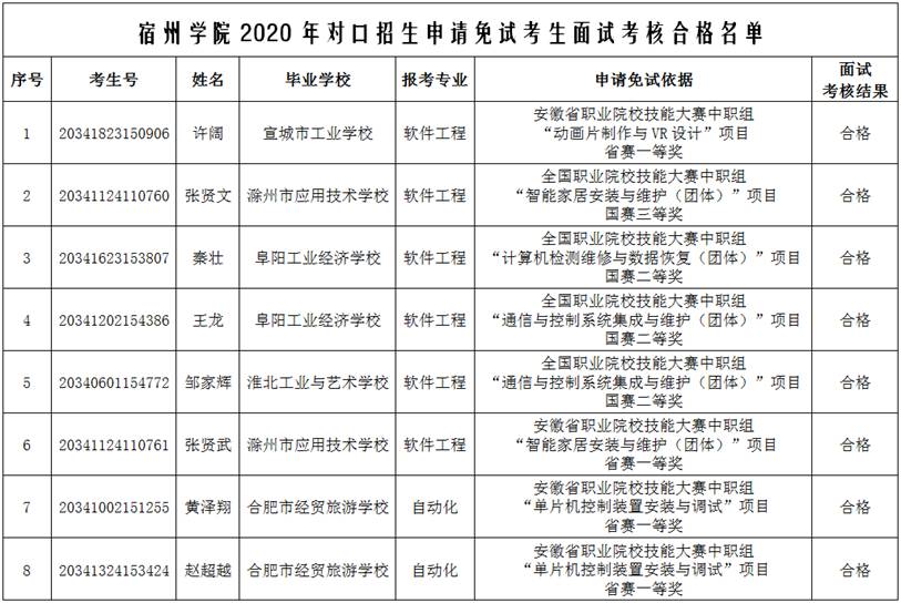根据《大赢家体育2020年面向中职毕业生对口招生章程》,经考生本人自愿申请,我校招生工作组审核,秦壮等14位考生的免试申请符合我校对口招生章程规定的免试基本条件。后经专家组面试,许阔等8位考生的面试考核合格,现将面试考核合格考生名单予以公示。