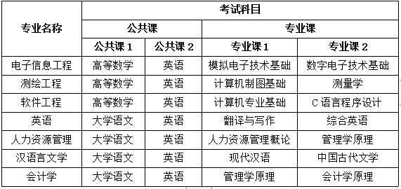 考试实行“2门公共课(各150分)+2门专业课(各150分)”的入学测试模式,总分600分。其中,公共课实行联考,统一命题、统一考试时间、统一评分标准。各招生专业具体考试科目如下(请考生注意公共课1、2和专业课1、2所对应的考试科目)。